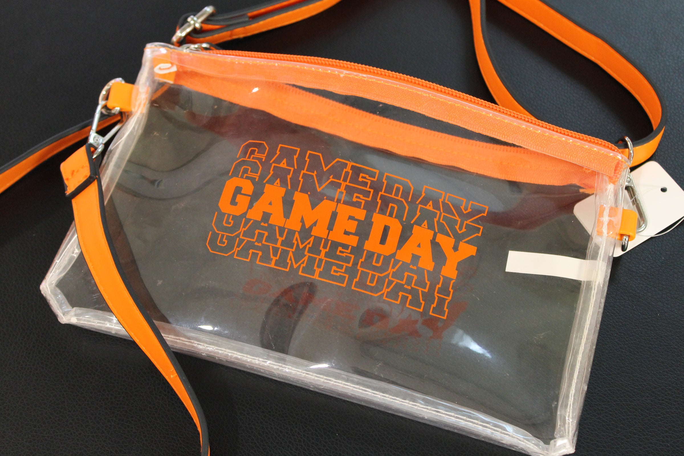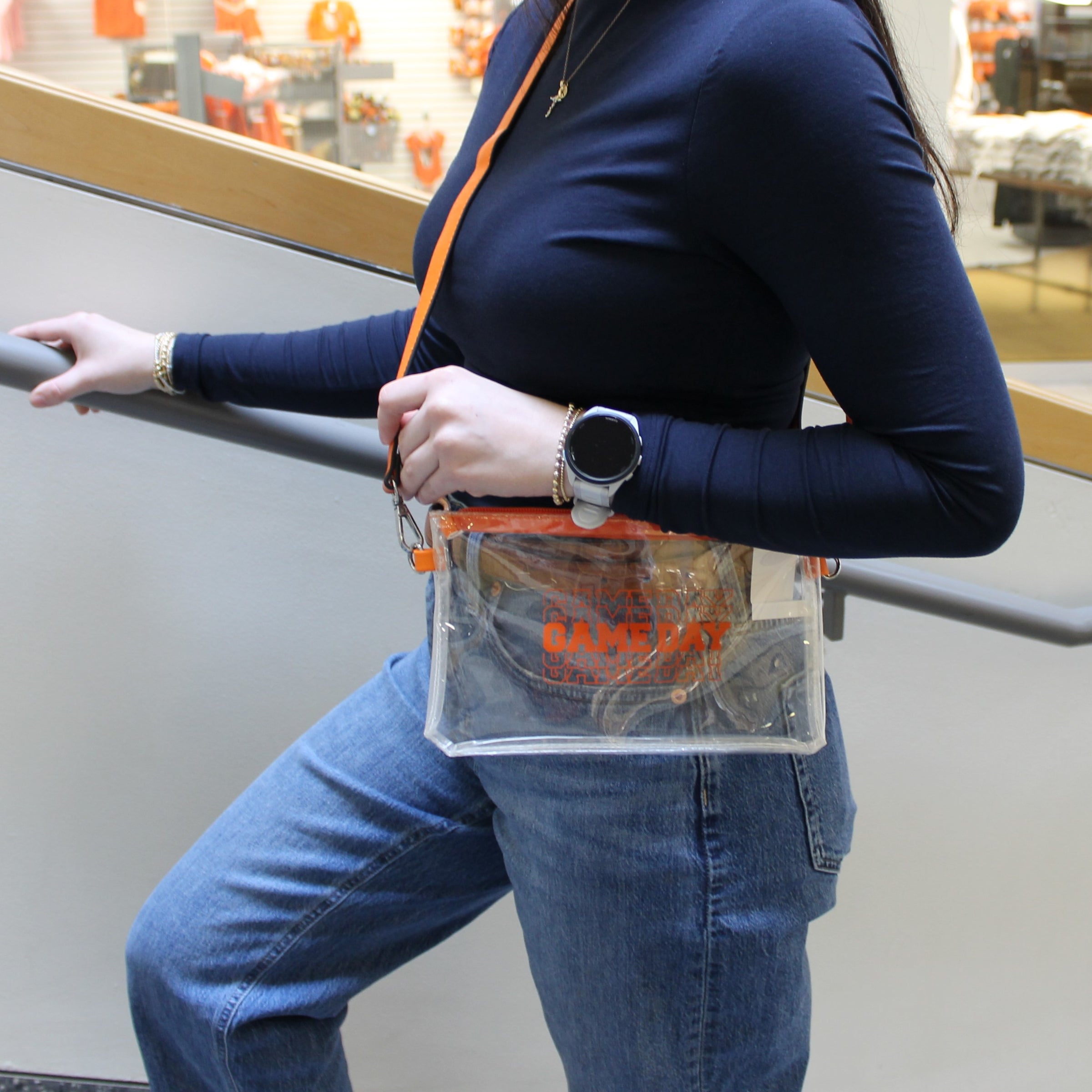 Make sure you're gameday ready with this clear crossbody bag with adjustable strap and orange details.