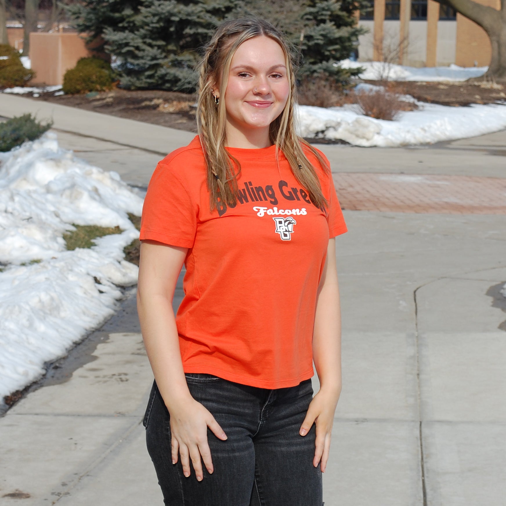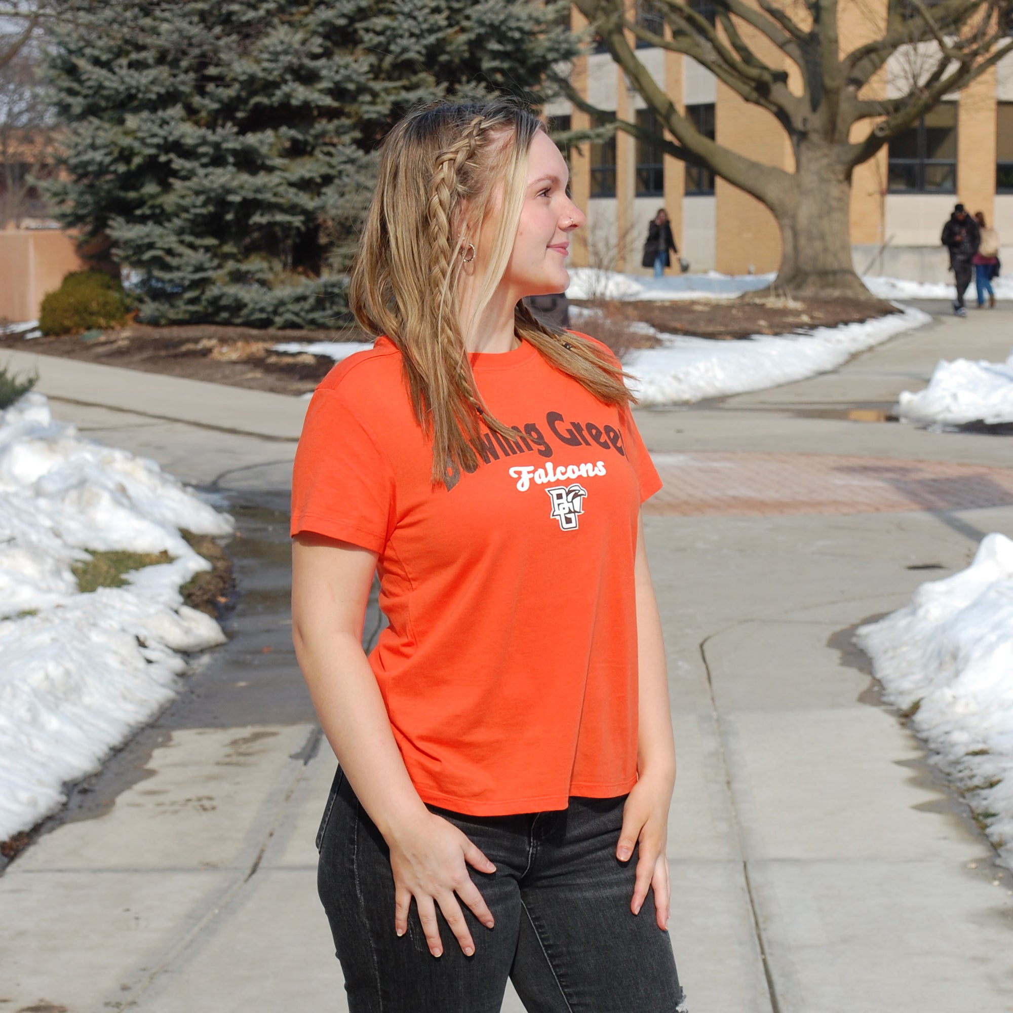 This vibrant orange BGSU t-shirt is a bold and fun way to show your school spirit! The front features "Bowling Green Falcons" written in two distinctive fonts—one playful, bubbly style and the other in elegant cursive, adding a touch of uniqueness and flair. Below the writing, you'll find the classic BGSU Peekaboo logo. Whether you're at a game or out with friends, this tee is perfect for showing your Falcon pride with style!